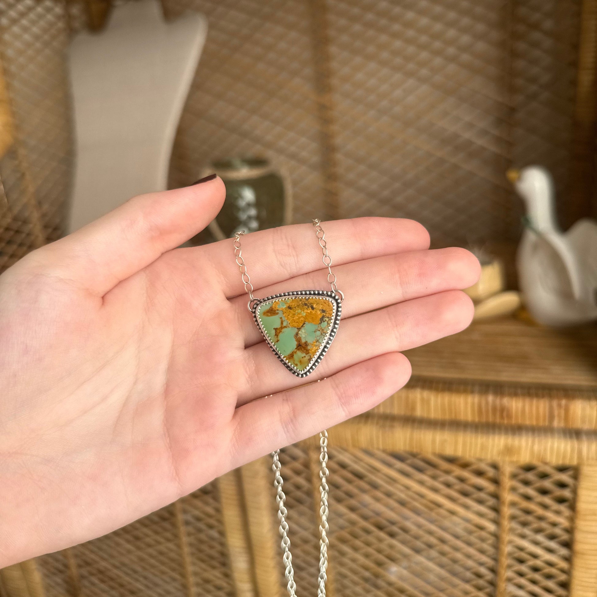 Handcrafted with a vibrant Royston turquoise pendant on a 16-inch sterling silver chain, showcasing stunning greens, golds, browns, and blues—perfect for a warm and beautiful fall look.